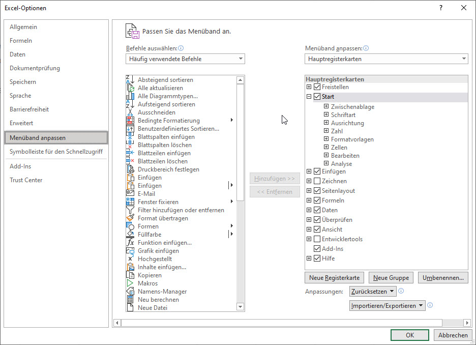 Das geht natürlich noch besser. Ihr könnt in Excel sogar bei Menüband anpassen in Excel ein eigenes Menü erstellen. Das wird dann oben neben den normalen Menüpunkten angezeigt, in Gruppen unterteilt und erhält nur die Funktionen, die ihr auch wirklich verwenden wollt.