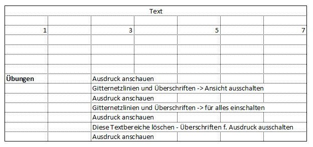 Überschriften sind die Spaltenüberschriften (A, B, C, D, …) und Zeilenüberschriften (1, 2, 3, 4, …) und Gitternetzlinien sind diese Orientierungslinien. Diese können für die Anzeige und für den Ausdruck jeweils aktiviert / deaktiviert werden.
