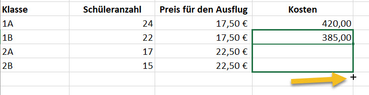 Es gibt es Excel auch die Funktion Autoausfüllen. Wenn wir also einmal schon die Excel Multiplikation berechnet haben, können wir nach dem Bestätigen der Formel noch einmal auf das Ergebnisfeld klicken. Dann rechts unten beim schwarzen Fadenkreuz die linke Maustaste drücken und gedrückt halten und runter ziehen bis zur letzten Zelle. Dann wird die Formel entsprechend kopiert und Excel berechnet in jeder Zelle das jeweilige Ergebnis.