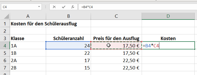 Wir klicken in die Ergebniszelle hinein (D4) und sagen dort