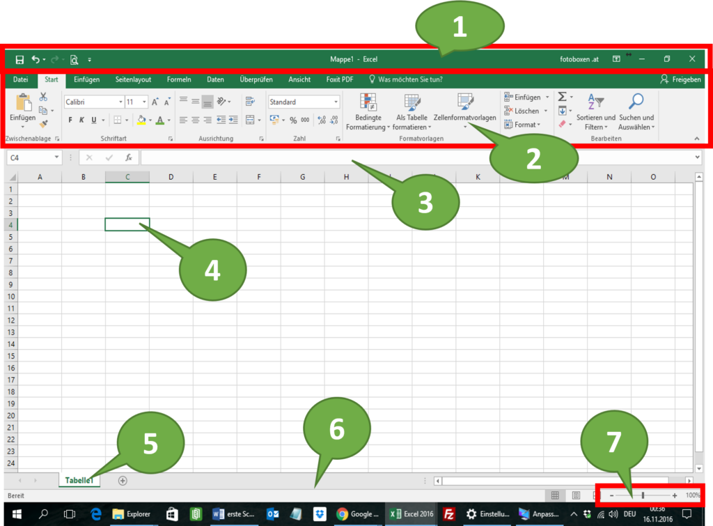5. Tabellenblatt – Hier sieht man auf welchem Tabellenblatt man gerade arbeitet. In einer Excel Arbeitsmappe kann man viele Tabellenblätter erstellen (z.b. Jänner, Februar, …)