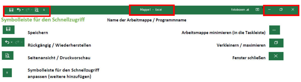 1. Titelleiste (von links nach rechts) Symbolleiste für den Schnellzugriff Dateiname / Mappe / Programm Minimieren / Maximieren / Schließen
