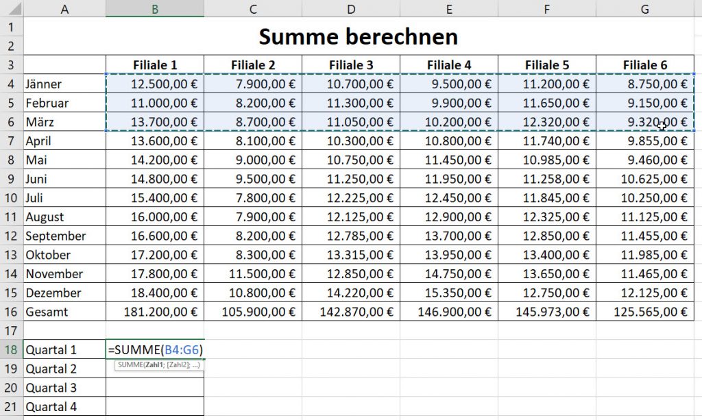 Wenn die Summe aber in einer nicht angrenzenden Zelle berechnet werden soll, dann muss man einen anderen Weg gehen.