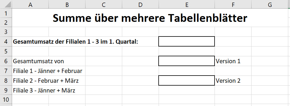 Im Beispiel und im Video gibt es eine Variante wo man über 3 Tabellenblätter die Summe aus der gleichen Zelle holt und eine Variante, wo man verschiedene Zellbereiche aus den jeweiligen Tabellenblätter nehmen soll.