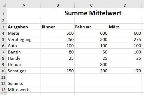 3. Errechnen Sie in B13 den Mittelwert aus B4 bis B10
