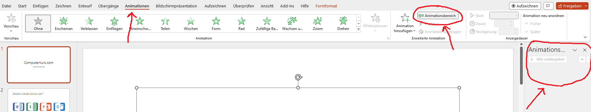 Hierfür klicken wir auf den Menüpunkt Animationen -> dort auf Animationsbereich, wodurch wir auf der rechten Seite eine neue Spalte bekommen, die der Animationsbereich ist.