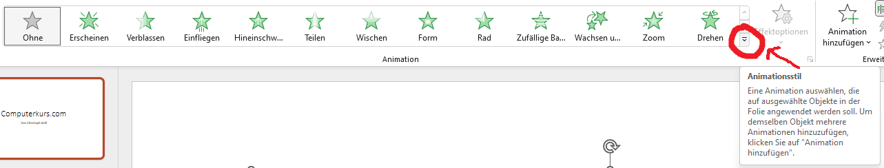 Oben in der Symbolleiste finden wir bei der Gruppe „Animationen“ rechts unten beim Doppelpfeil die Animationsstile zur Auswahl.