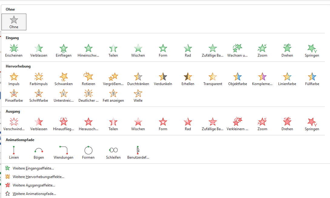 Da beim Doppelpfeil nach unten nur ein paar Animationsstile angezeigt werden, gibt es unten auch die Punkte „weitere …. Effekte“. Dort sind alle Effekte sichtbar.