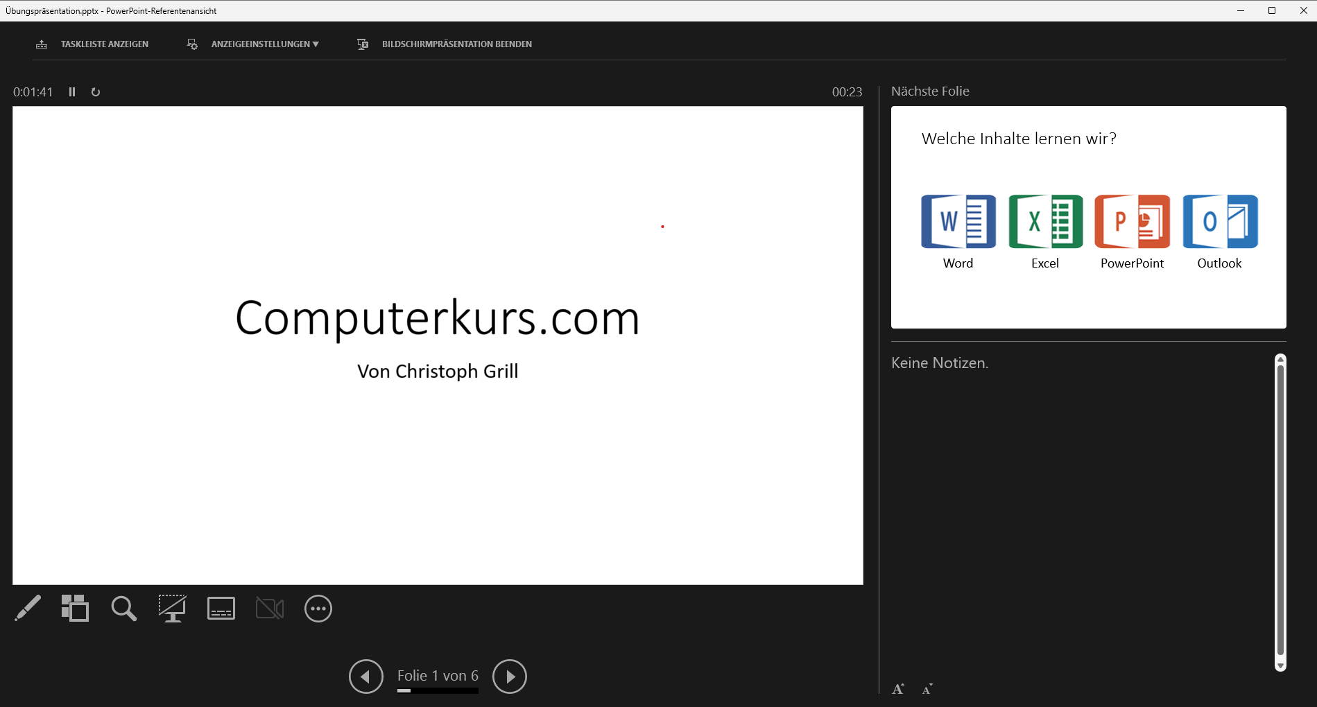 Wenn wir mehrere Bildschirme angeschlossen haben (zum Beispiel den Laptop und den Beamer), dann bekommt der Laptop die sogenannte Referentenansicht.