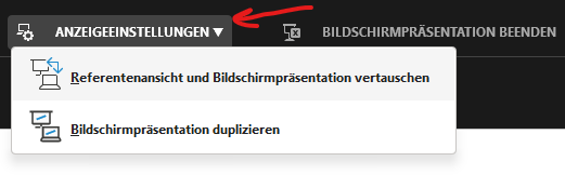 Oben können wir dann bei den Anzeigeeinstellungen von der Referentenansicht zur BildschirmprÀsentation wechseln, falls wir doch am Hauptbildschirm arbeiten und hier die PrÀsentation ablaufen soll.