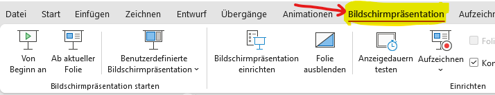 Wir können aber auch oben auf den MenĂŒpunkt âBildschirmprĂ€senationâ klicken und dort auswĂ€hlen, ob wir von der aktuellen Folie oder von Beginn die PrĂ€sentation abspielen möchte.