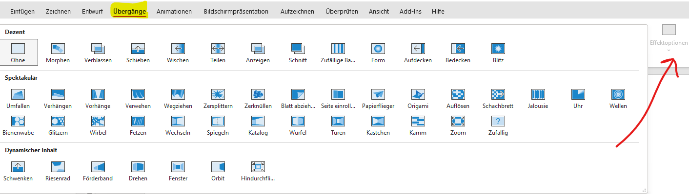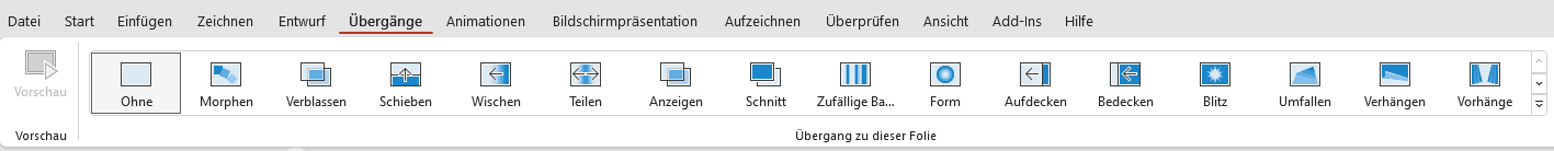 Wenn wir oben auf den MenĂŒpunkt ĂbergĂ€nge klicken, kommen wir zu den FolienĂŒbergangen hin. Wenn wir hier einen Ăbergang auswĂ€hlen, dann ist er auf der aktuellen Folie eingestellt.Â