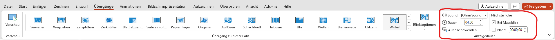 Weiter gibt es hier die Möglichkeit einen Sound abzugeben, der beim FolienĂŒbergang abgespielt werden soll, die Zeit, wie lange ein Ăbergang dauert kann eingestellt werden.