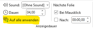 Wenn wir einen FolienĂŒbergang haben, der uns gefĂ€llt, dann können wir mit dem Klick auf âauf alle anwendenâ diesen FolienĂŒbergang fĂŒr alle Folien der PrĂ€sentation einstellen.