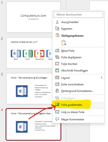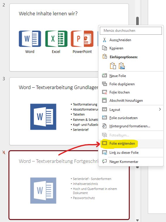 Wenn wir die Folie wieder einblenden wollen, klicken wir einfach wieder links auf die ausgeblendete Folie in der Vorschau, dann die rechte Maustaste und auf die Zeile „Folie einblenden“.