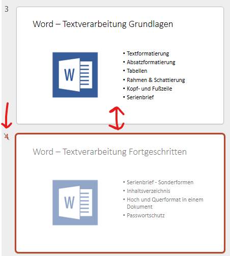 Oder wir haben hier Kursinhalte – aber die Folie für den Fortgeschrittenen Word Kurs soll bei dieser Präsentation nicht angezeigt werden, weil es zum Beispiel zu wenig Anmeldungen gegeben hat.