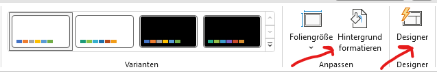Beim PowerPoint DESIGN wird jede Folie der Präsentation mit dem jeweiligen Design formatiert. Bei Varianten gibt es manchmal verschiedene Farbprofile und beim Designer können wir auf jede einzelne Folie gehen und dort noch durch die künstliche Intelligenz Optimierungen vornehmen.