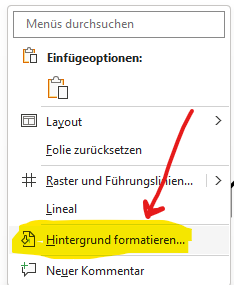 Am einfachsten können wir am Rand & Hintergrund der Folie auf die rechte Maustaste drücken und dort auf den Eintrag Hintergrund formatieren klicken.