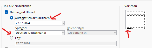 Diese wird, wie in der Vorschau ersichtlich ist links auf den Folien eingefügt. Hier haben wir zum einen die Einstellung, ob sich das Datum automatisch aktualisieren soll, dann wird es als Feld eingefügt, welches sich jedes Mal auf das aktuelle Datum aktualisiert.