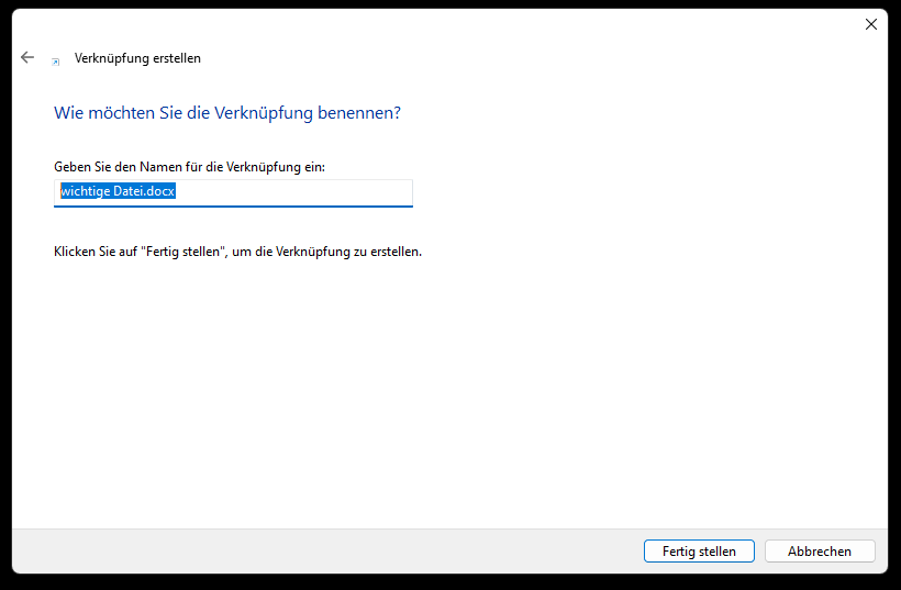 Wenn man diese ausgewählt hat und mit OK und weiter bestätigt, dann kommt noch eine weitere Abfrage, nämlich wie die Verknüpfung heißen soll.