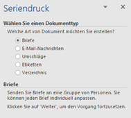 Wir bleiben rechts oben bei „Briefe“ aktiv. Hier wird vom Assistenten gefragt, ob wir Briefe, Umschläge, Mails, etc. erstellen wollen. Wir haben hier nun den Serienbrief.